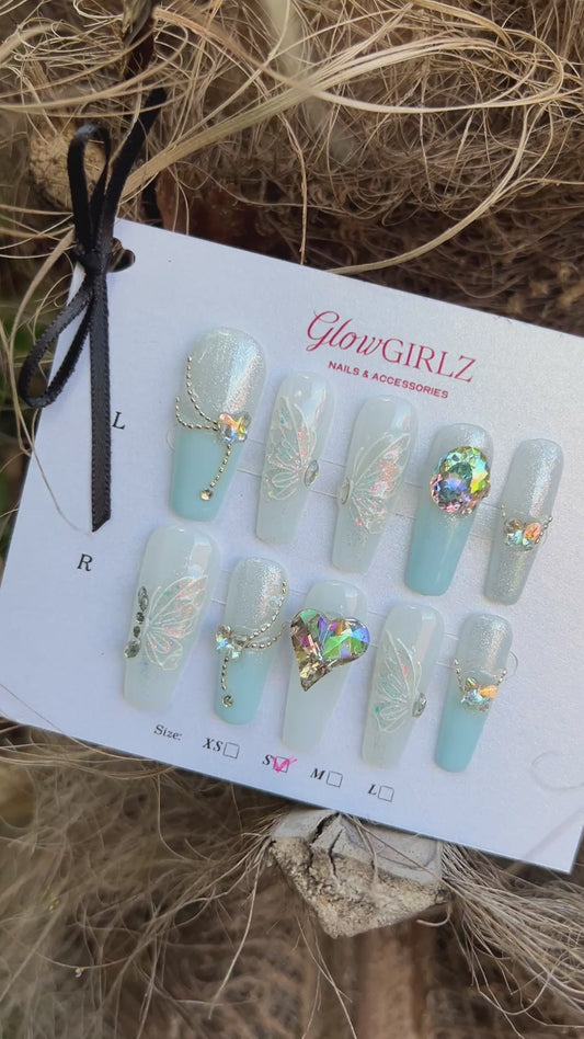 «SKY BUTTERFLY HEARTS»-Sky Blue Press-On Nails with White Butterflies & Heart Rhinestones, Sexy & Romantic Design