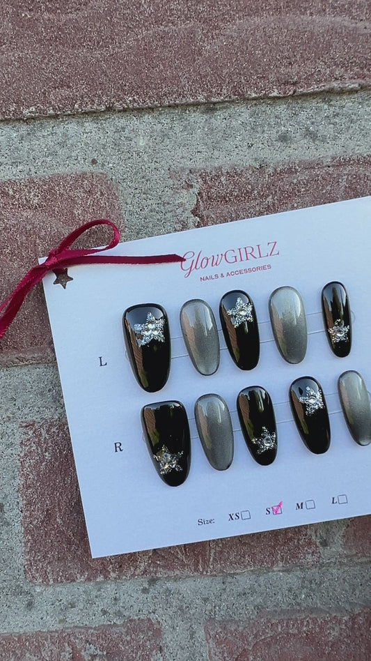 «OBSIDIAN MIST NAILS»– Black & Silver Cat Eye Press-On Nails with Glitter Star Accents, Reusable Glam Nail Set