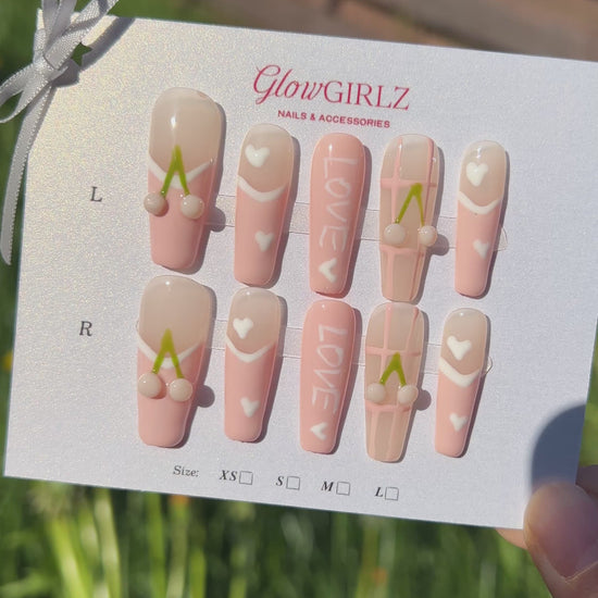 «CHERRY KISS FRENCH TIPS» – Pink French Press-On Nails with Cherries, Hearts & ‘LOVE’ Lettering, Cute Soft Girl Aesthetic, Reusable Handmade Nail Set