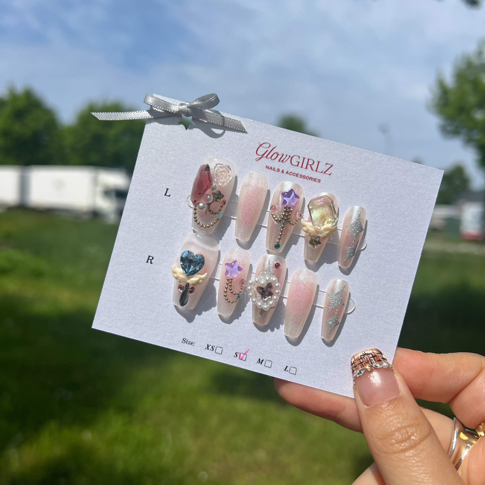 Crystal Orbit Nails — A galaxy at your fingertips. This ethereal set by GLOWGIRLZ is inspired by cosmic dreams and starry skies — with 3D gems, iridescent pearls, and celestial silver accents orbiting across a soft pastel glow. Each nail is hand-decorated with multicolour crystals, shimmering stars, and sculpted details that feel straight out of a fairytale.