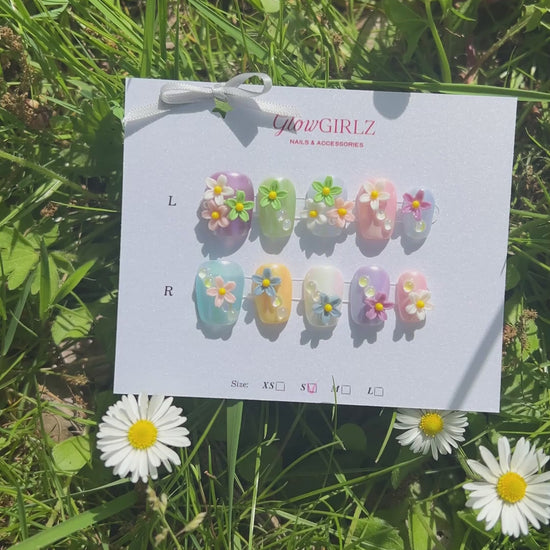 Floral Laser Bloom— holographic Press-On Nails with 3D Colorful Flowers & Dewy Droplets. Step into a pastel garden dream. This ultra-glowy set features hand-sculpted 3D blooms in rainbow hues, layered over soft holographic gradients with raindrop-inspired beads. Every nail looks like it’s kissed by spring light and sprinkled with magic