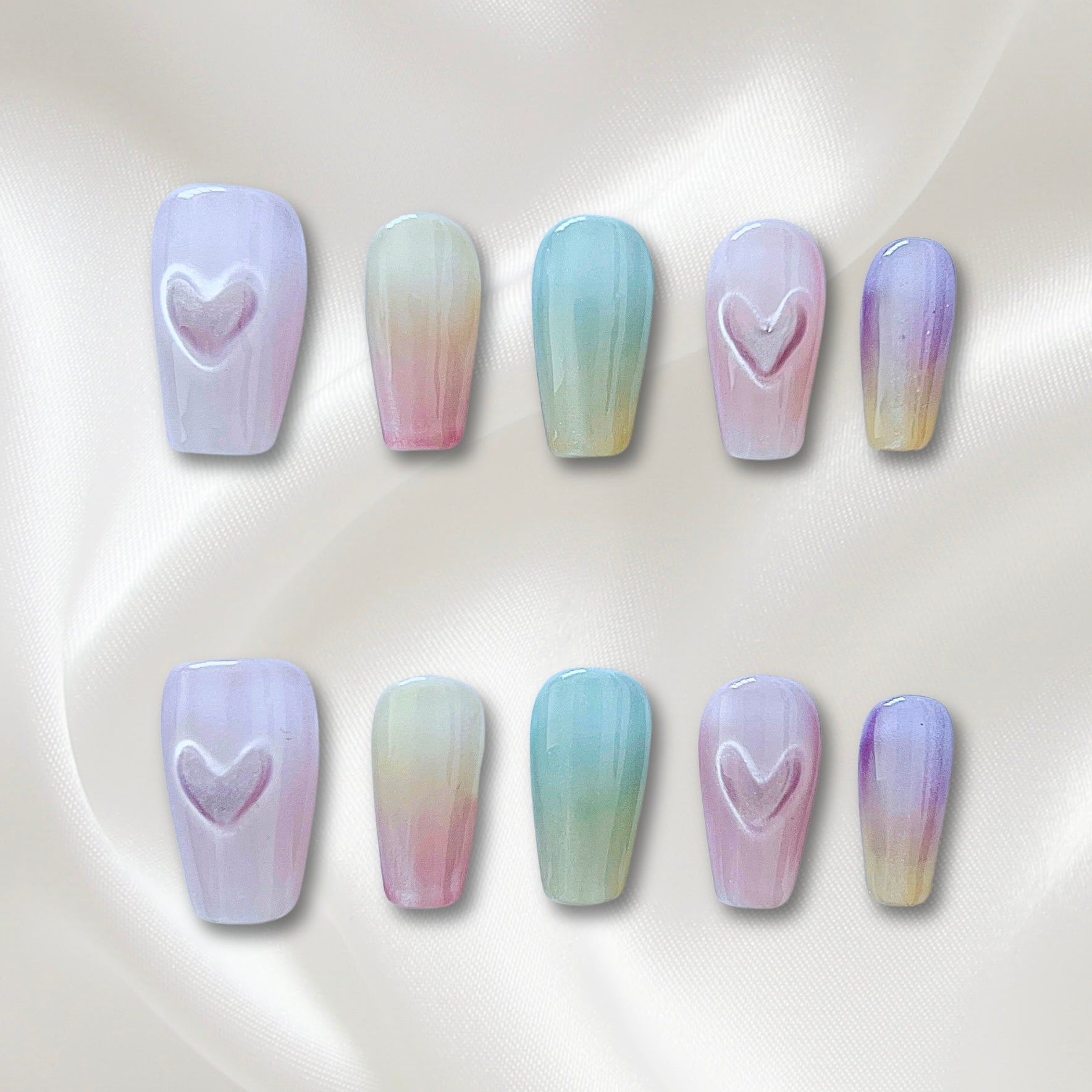 «HEART GLOW SWIRL»- Colorful Press-On Nails with Heart-Shaped Cat Eye Shine, Dreamy Pastel Design, Pastel Rainbow Nails, Ombré Nails