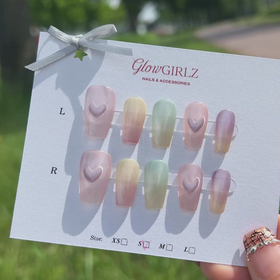 Heart Glow Swirl — Fall in love at first swipe with this handmade press-on nail set by GLOWGIRLZ — a dreamy blend of pastel ombré, glossy finish, and hand-sculpted 3D hearts. Inspired by soft skies, cozy sunsets, and those fluttery little feelings that make you glow.