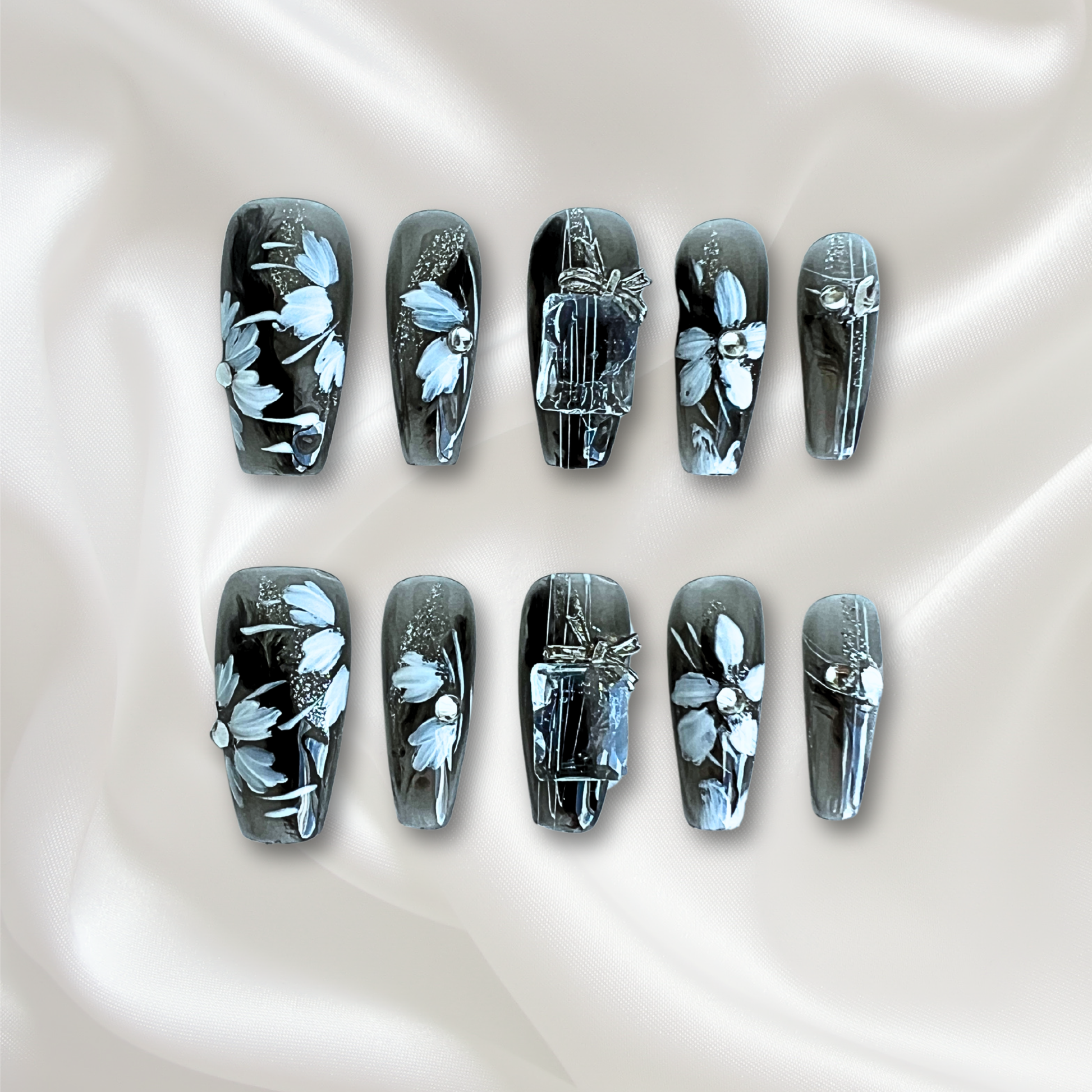 «MIDNIGHT BLOOM NAILS»– Hand-Painted Black Floral Press-On Nails, Elegant Glossy Black Base with Delicate White Flowers & Crystal Accents