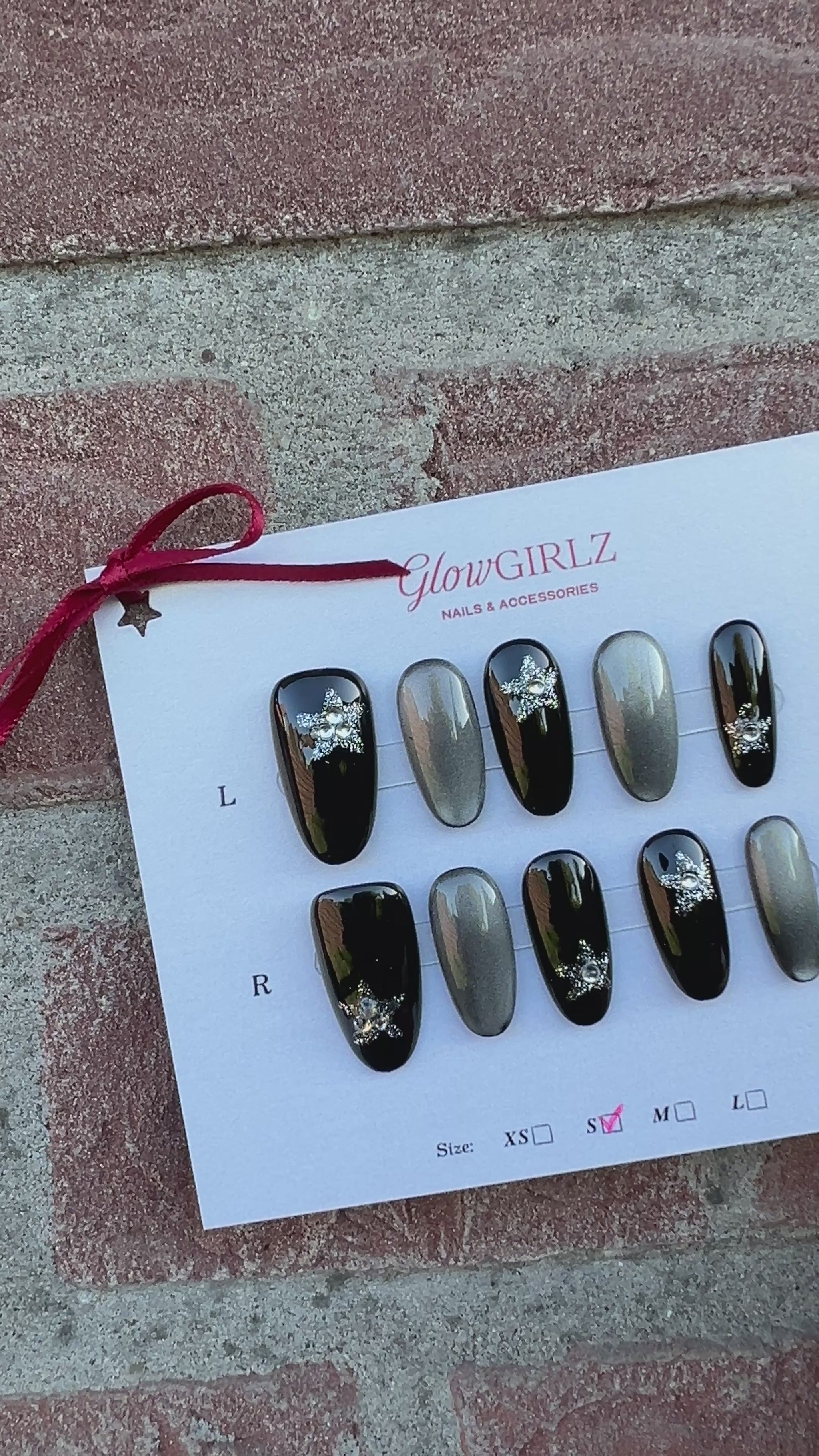Step into the night with Obsidian Mist, a handmade press-on nail set featuring glossy black and metallic silver cat eye gradient, adorned with sparkling 3D glitter stars. Perfect for edgy glam looks, night outs, or galaxy-core aesthetics.