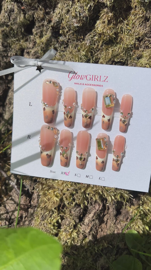 «WILD CHIC COFFIN TIPS»- Leopard French Nails with Rhinestones, Long Bling Press-On Set