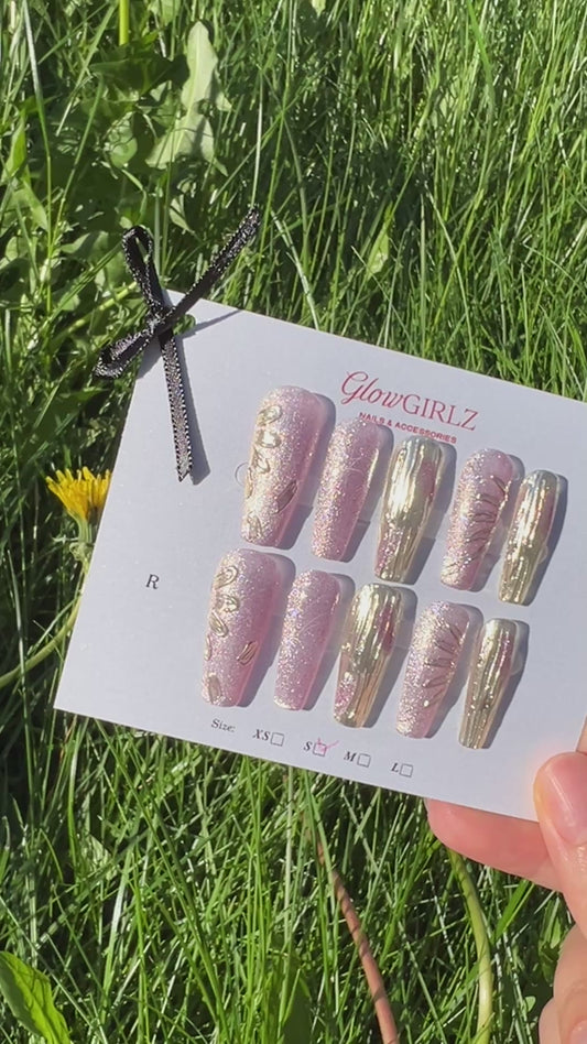 «AURORA HEARTBEAM NAILS»– Pink Cat Eye Press-On Nails with Glowing 3D Heart Design, Soft Glam & Coquette Style, Pink Iridescent Cat Eye Press-On Nails, 2025 Trending Nail Design
