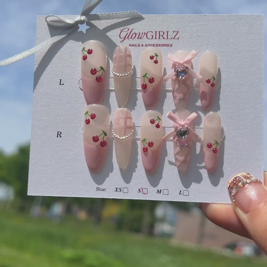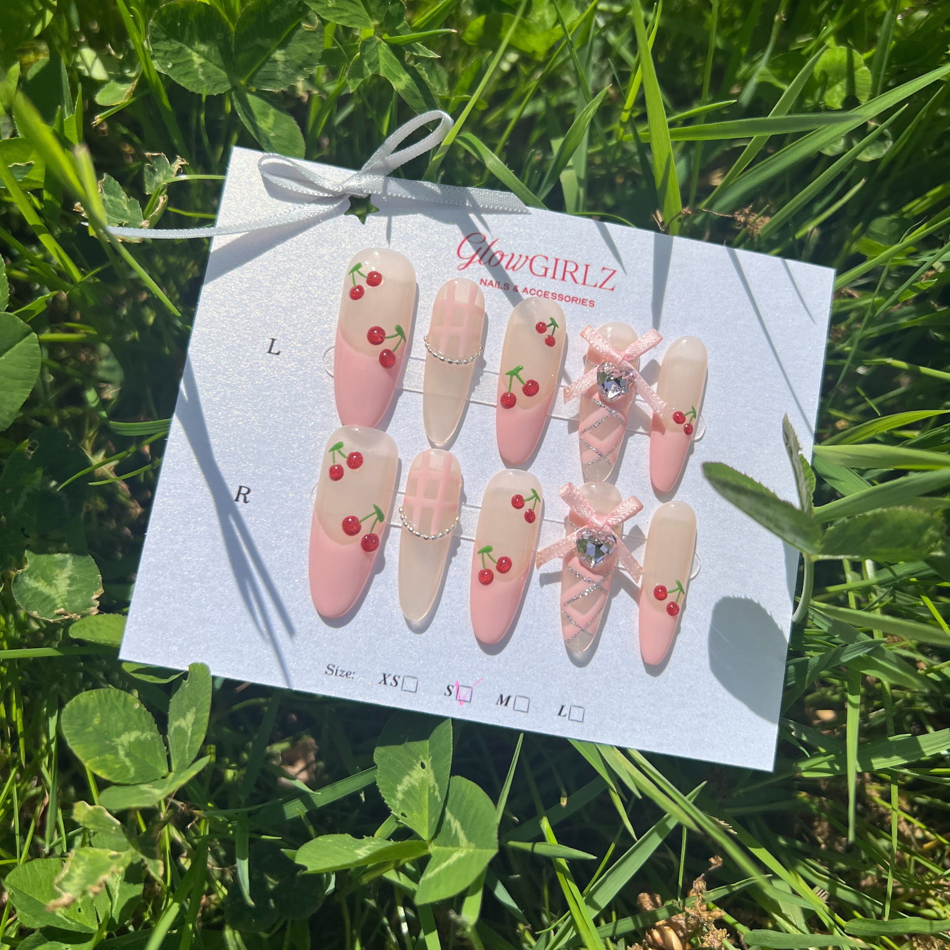 Cherry Blossom Bows — A handmade press-on nail set by GLOWGIRLZ, designed to capture the sweetness of spring with a playful, girly twist. This unique design features hand-painted 3D cherry details, soft baby pink French tips, and delicate gingham accents. Finished with a satin bow and crystal heart centrepiece inspired by ballet ribbons and coquette core, it’s the perfect blend of cute and classy.