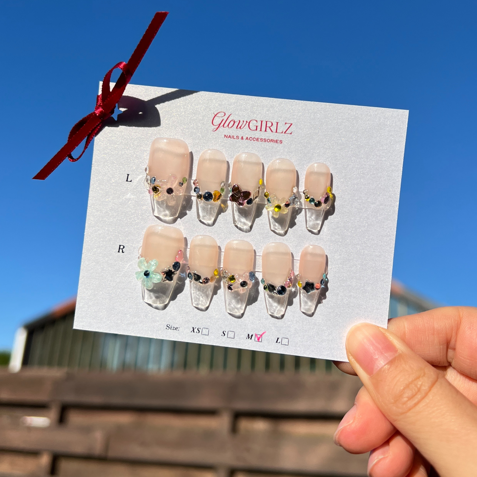«BARE BLOSSOM CRYSTALS»- Soft Nude Floral Press-On Nails with Clear Tips & Rhinestone Accents, Spring Summer Aesthetic