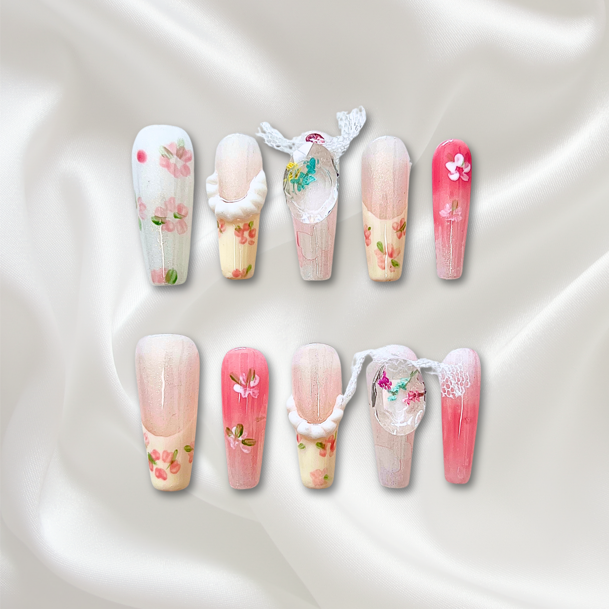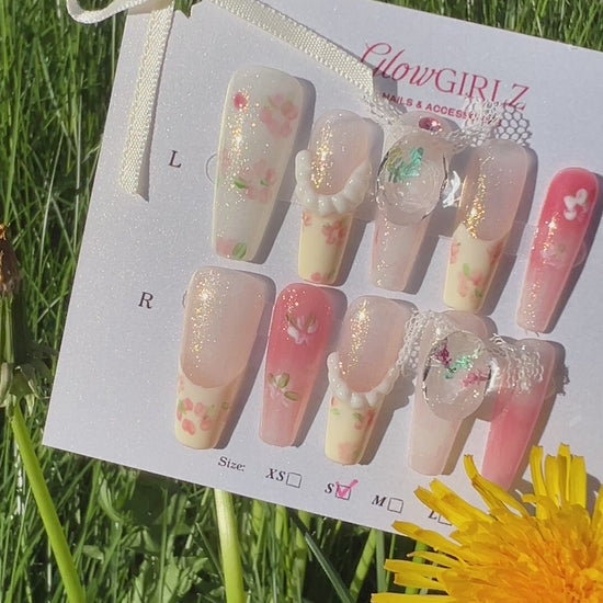 Blossom Breeze Ombré — Let your fingertips bloom — a dreamy set of pink gradient press-on nails hand-painted with delicate floral accents and finished with soft lace textures. This set captures the airy charm of spring and the carefree spirit of summer, combining romantic pastels, garden-inspired patterns, and subtle 3D lace for a uniquely fresh vibe.