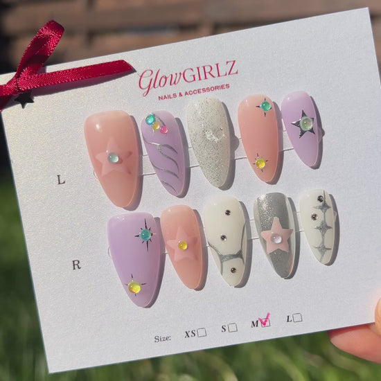 Shine like a star with the Celestial Dream Star Nails – a dreamy mix of pink, lavender, silver, and chrome with 3D stars, galaxy swirls, shimmering crystals, and cosmic sparkle details. This handcrafted press-on nail set is perfect for stargazers, soft girls, and trend lovers into Y2K, fairycore, or coquette styles.