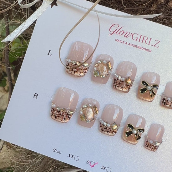 «COCO CLASSIC FRENCH» – Short French Press-On Nails with Bow Charm, 3D Bow & Crystal Accents, Sweet & Edgy Nail Design, Charm French, Tweed Nail Art