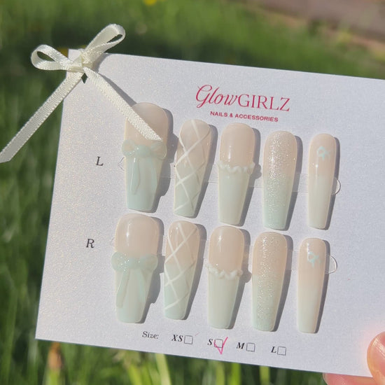 Coquette Blue Bows Nails- Indulge in your soft-girl era with our delicate blend of light blue and white ombré nails with subtle shimmer, finished with charming 3D satin bows and dainty white lace-inspired lines. These press-on nails are handmade with salon-grade gel, offering a flawless glossy finish that’s reusable and secure.