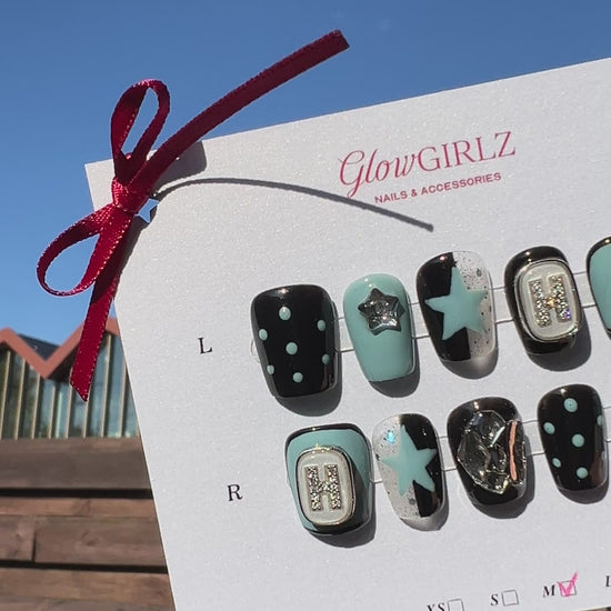 Level up your style with the Cosmic Punk press-on nails – a bold combo of glossy black and sky blue featuring 3D stars, chrome elements, glitter accents, and rhinestone lettering. This edgy Y2K-inspired set is perfect for trendsetters who love a mix of streetwear and celestial energy