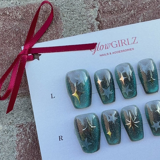 Bring the night sky to your fingertips with the Midnight Aurora Galaxy – a deep blue and black ombré press-on nail set with glittery cosmic shimmer, silver starbursts, and dreamy shooting star designs. Perfect for lovers of astrology, galaxy vibes, and bold celestial aesthetics.Hand-painted, reusable, and ideal for party looks, night outs, or cosmic-core style.