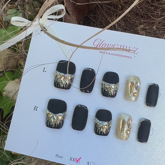 Midnight Spark Matte- these press-on nails are an ultimate blend of edgy and elegant. These matte black nails feature striking silver glitter accents that shimmer under the light, giving you a bold and glamorous look perfect for parties, nights out, or everyday confidence. Whether you’re into matte black nails, glitter press-ons, or classy nail art, this set brings it all together in one luxe design.