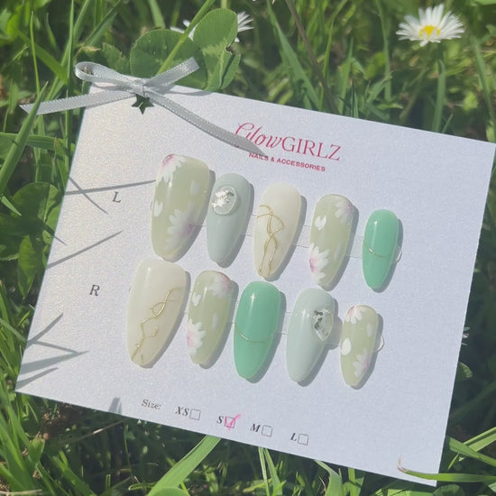 Mint Bloom Nails — а handmade press-on nail set by GLOWGIRLZ, inspired by pastel skies and golden hour magic. This dreamy set features a delicate blend of aqua, lilac, and soft shimmer with hand-painted 3D floral accents and gold foil details. Crafted with salon-grade gel for a premium, reusable finish — perfect for girlz who glow on the go.