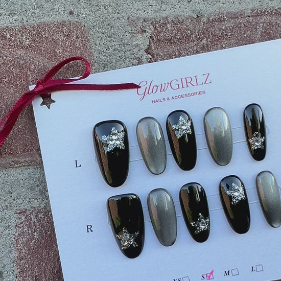 «OBSIDIAN MIST NAILS»– Black & Silver Cat Eye Press-On Nails with Glitter Star Accents, Reusable Glam Nail Set