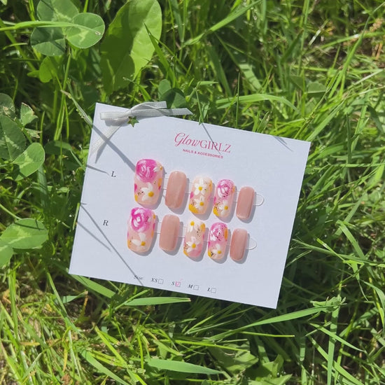 Peachy Daisy Glow — A handmade press-on nail set by GLOWGIRLZ, inspired by soft mornings, blooming gardens, and daydreams under the sun. Featuring hand-painted daisies, soft pink petals, and golden flecks on creamy nude and blush cat eye bases — this set is the definition of gentle glow. Crafted with salon-grade gel for a high-gloss, reusable finish. Perfect for picnics, brunches and girls who glow from within.