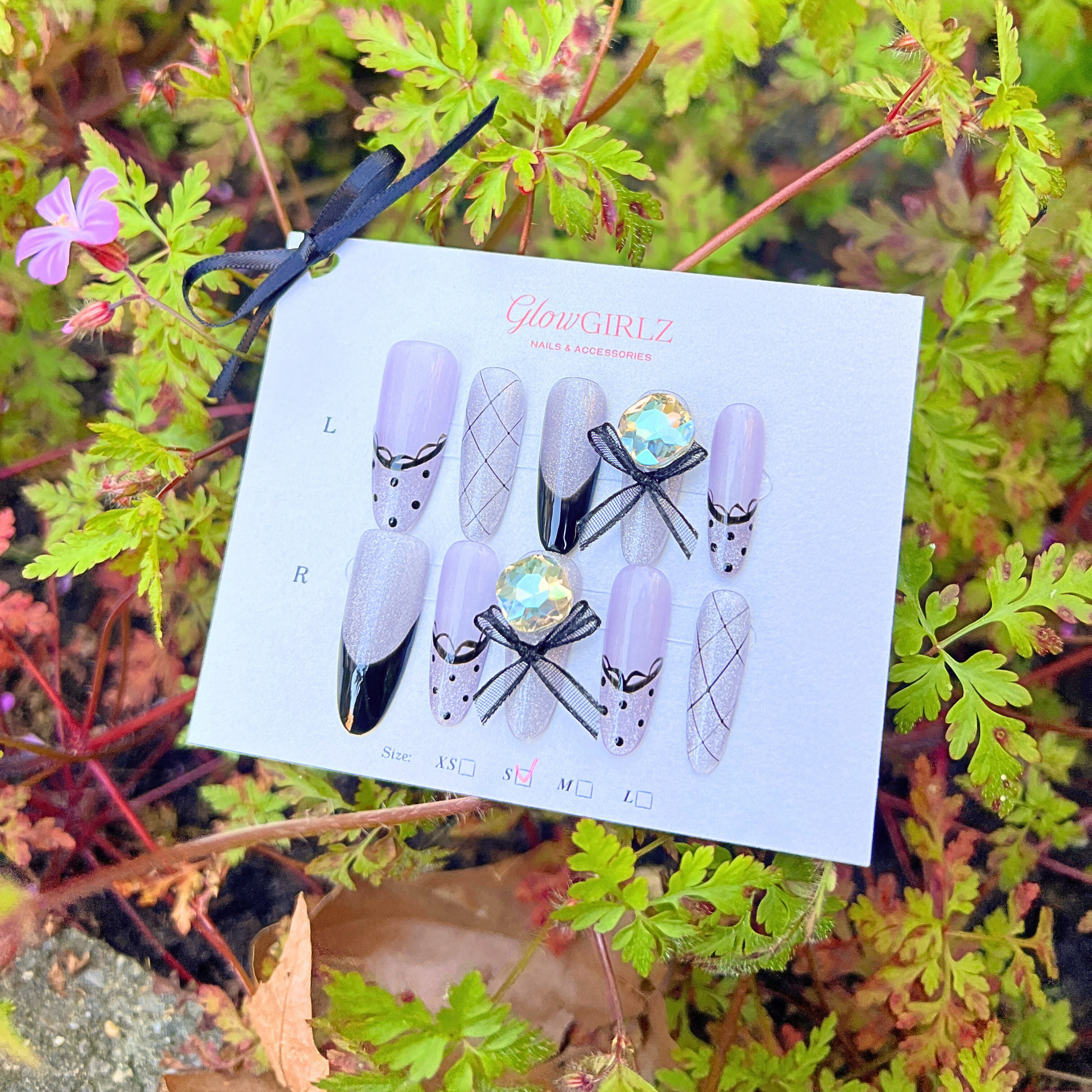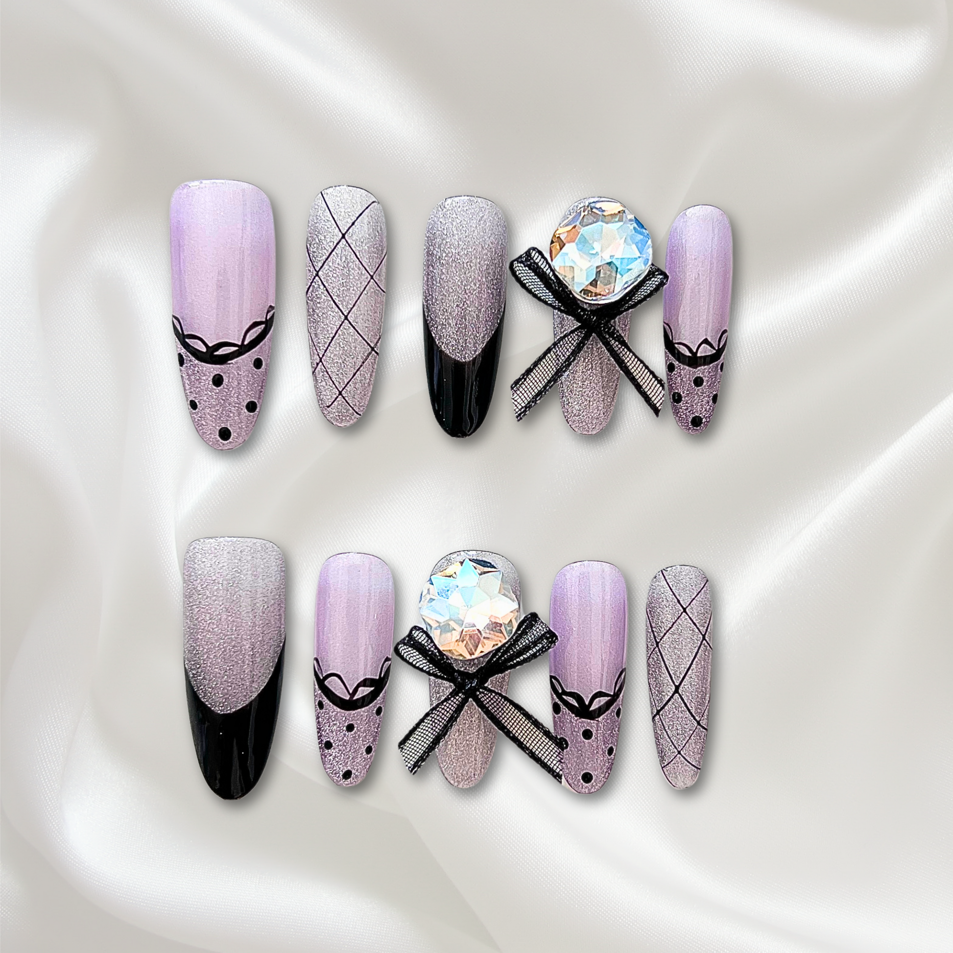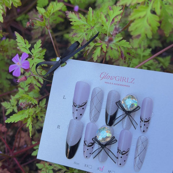Polka Plaid Princess — Step into soft-girl elegance with Polka Plaid Princess — a whimsical press-on nail set featuring pastel lilac tones, delicate black French tips, and playful polka dots. Each nail is handcrafted with shimmering finishes, checkered plaid details, and topped with luxe 3D bows and iridescent crystals for that perfect princess-core vibe. This set is for the girlz who adore charm with a twist — cute, classy, and just a little bit cheeky.