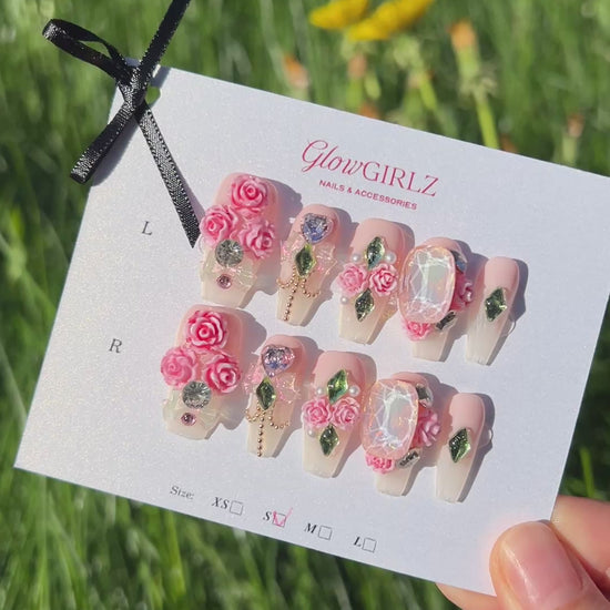Rosy Bloom Nails — a lush, romantic press-on set bursting with sculpted pink roses, sparkling crystals, and soft ombré tones. Each nail is a miniature bouquet, handcrafted with delicate green gem leaves and heart-cut rhinestones for extra glow. Perfect for date nights, garden parties, or anytime you want to feel soft, feminine, and unforgettable.