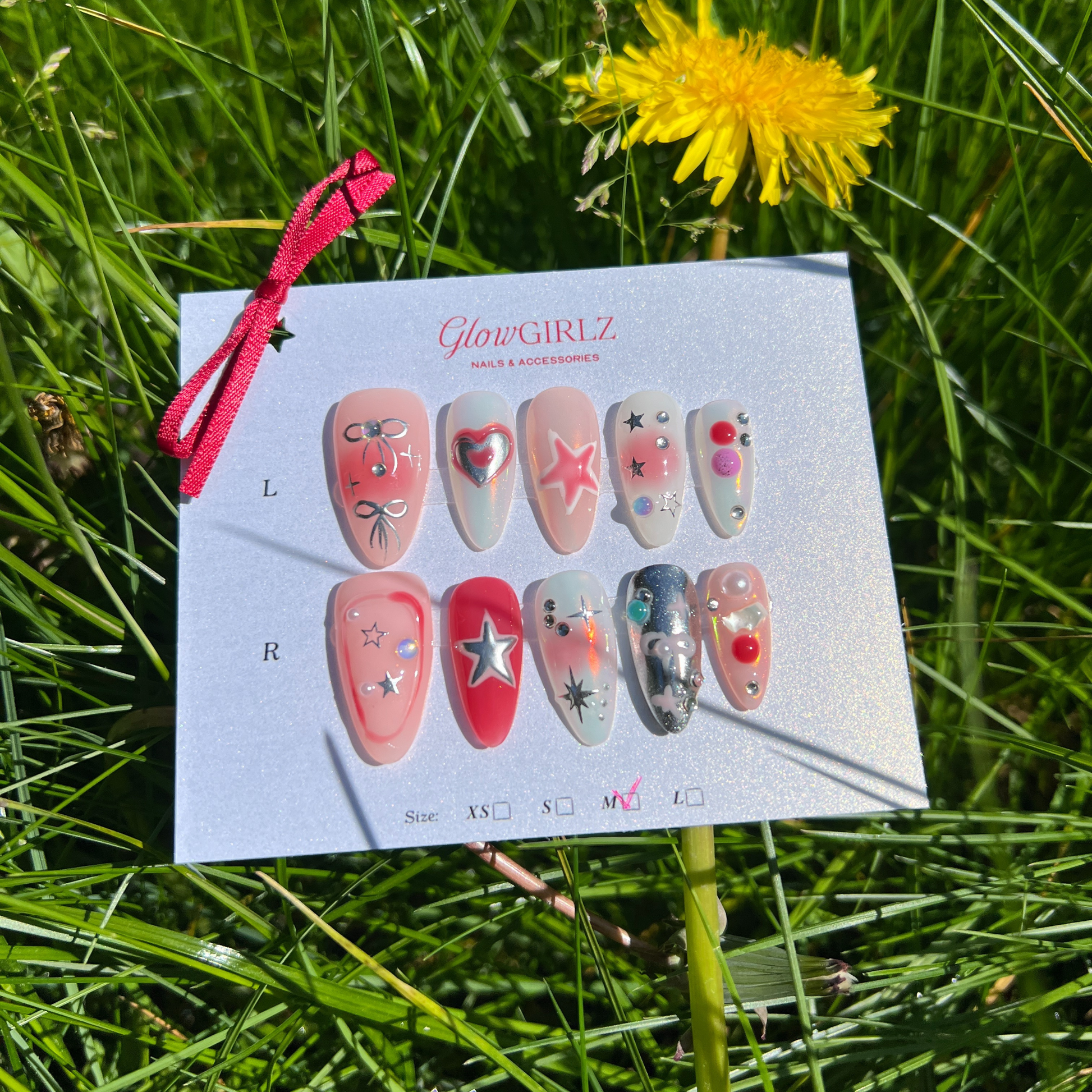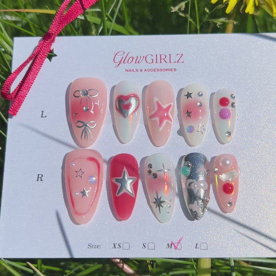 Get dreamy space vibes with the Sweet Galaxy press-on nails – a stunning pink gradient set decorated with 3D stars, chrome hearts, rhinestones, and cute bows. Designed for Y2K lovers, coquette girls, and Gen Z trendsetters who adore all things kawaii and sparkly. Handmade with love and fully reusable, these nails are lightweight, durable, and easy to apply