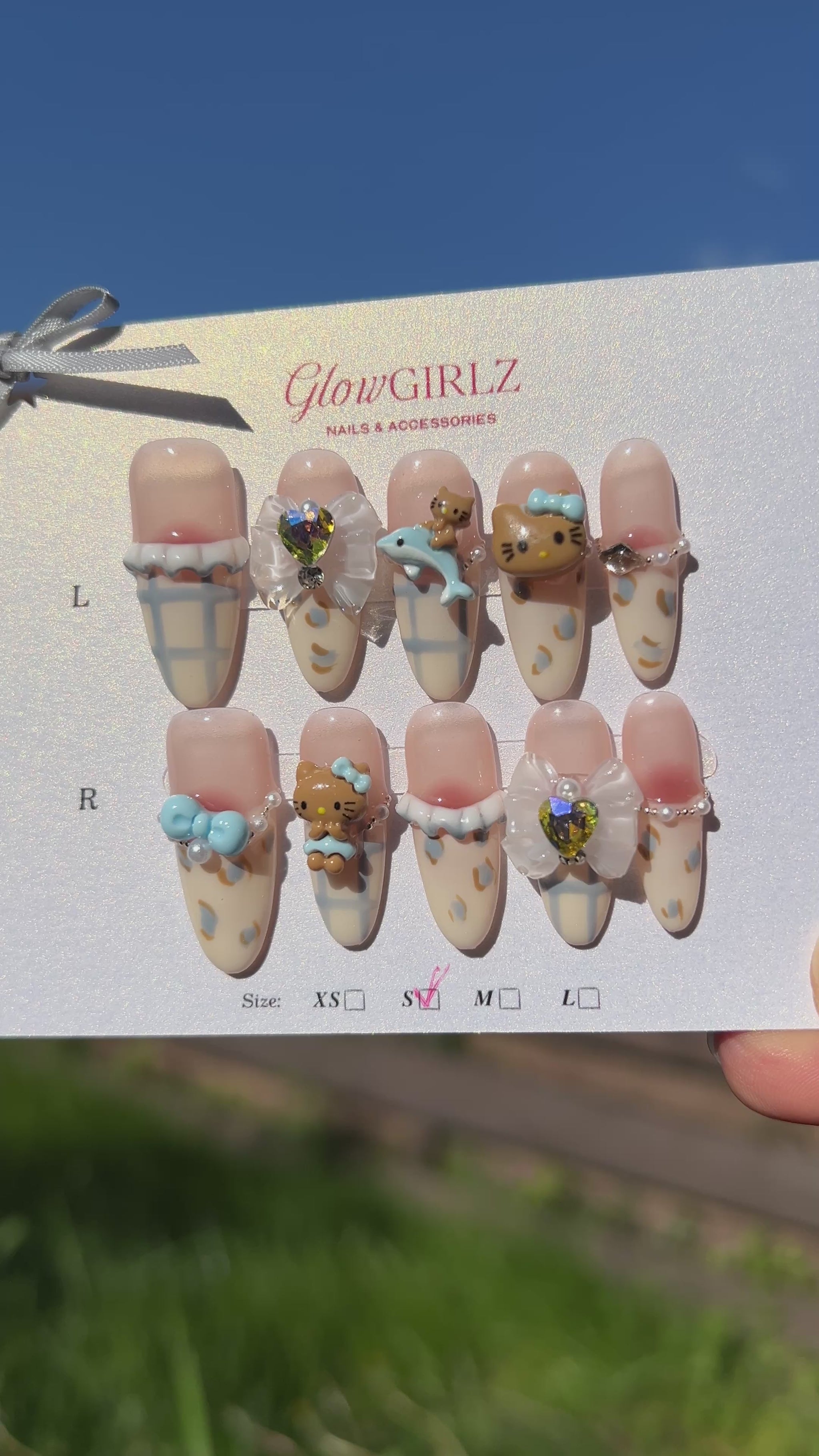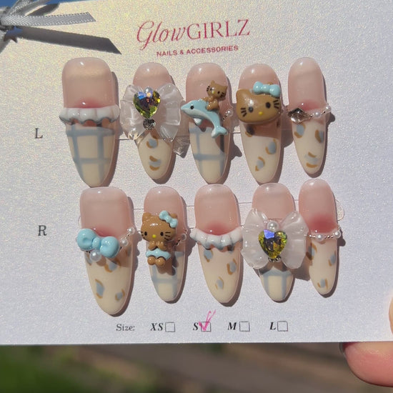 «SWEET KAWAII CHARMS» – Hello Kitty Press-On Nails with Bows, Dolphins & Rhinestones, Cute 3D Kawaii Nail Art, Soft Girl Aesthetic, Reusable & Ready-to-Wear