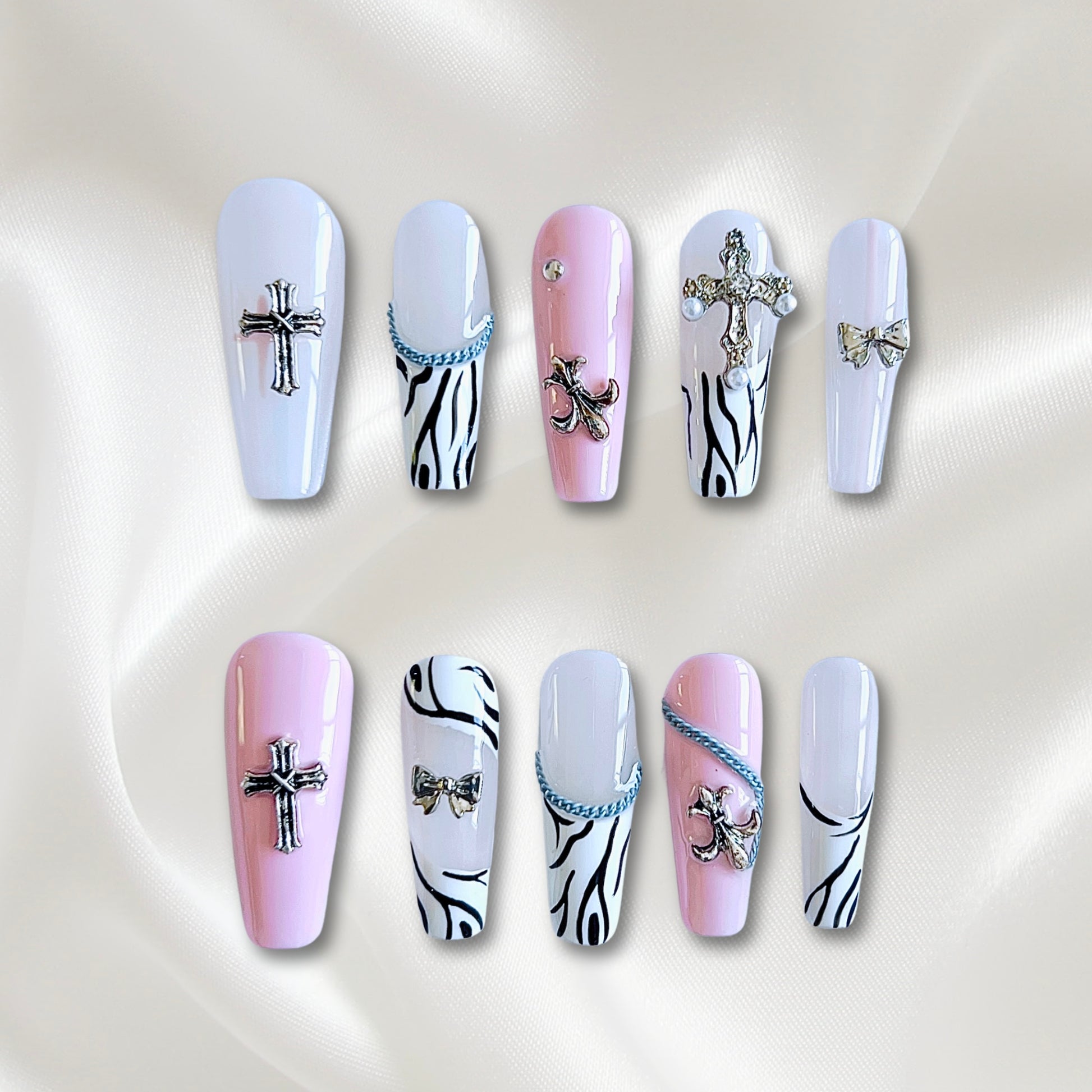 «WILD WEST BABE NAILS»- Pink Animal Print Press-On Nails with Cross Charms, Sweet Goth Style, Zebra Print Nails
